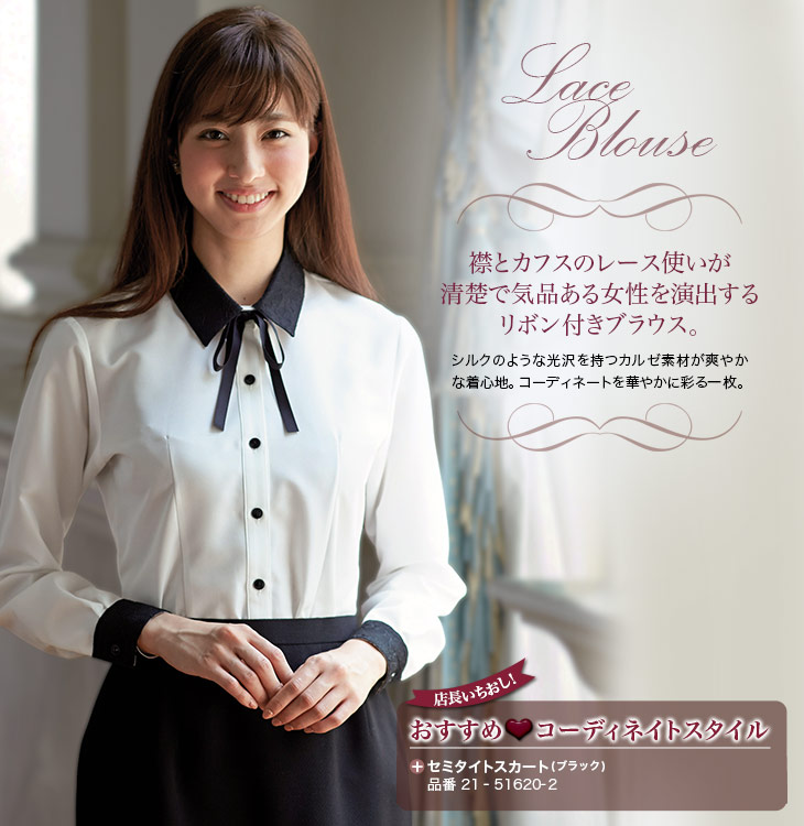 襟とカフスのレース使いがフェミニンなリボン付ブラウス。