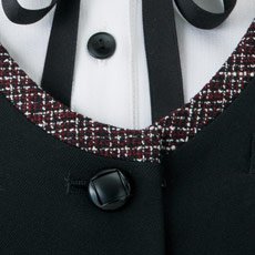 襟ぐりのツイード素材のパイピングが上品なアクセント。