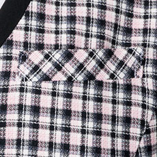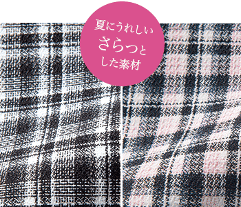 アシンメトリーのチェック柄は、黒とピンクの2色展開。東レのスプリンジーRの透け防止、UVカット効果のある糸を使っており、白ベースでも透けにくくて安心。