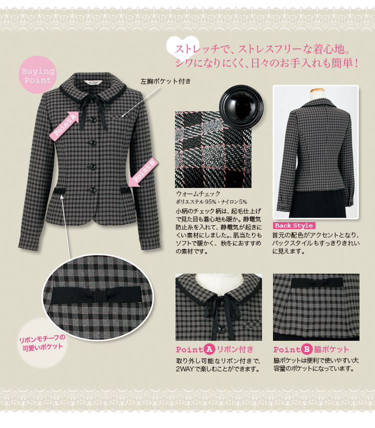 会社の事務服として注文しました、私服のいつも来ているサイズを注文すると制服関係は小さめにできていると思い1サイズあげたサイズで夏に【商品番号21-26609[春夏用]七分袖オーバーブラウス】を注文、それでちょうどよかったため、今回冬服を注文する際、同じサイズで注文したところ、袖の長さはちょうどいいのですが、胸のあたりが小さい・・・引っ張られてしまう感じで少し隙間があくという。。。同じサイズで商品により、違いがあるのか、という感想です。着れないわけではないし、そのまま着用していますが、勤務中少々ストレスを感じます。デザインは可愛かっただけに着用感は残念でした。