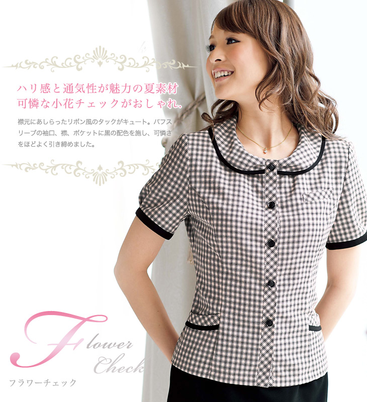【在庫限り】[春夏用]程良い可憐さが大人気 フラワーチェックオーバーブラウス(21-26190)