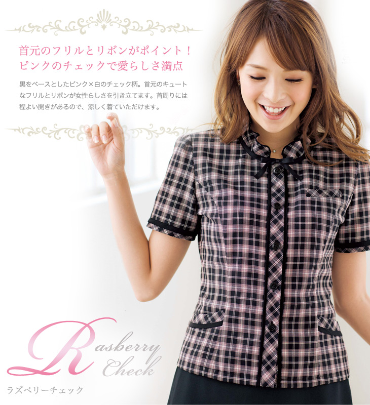 【在庫限り】[春夏用]フリルとリボンで女性らしさたっぷり ラズベリーチェックオーバーブラウス[女性用](21-26310)