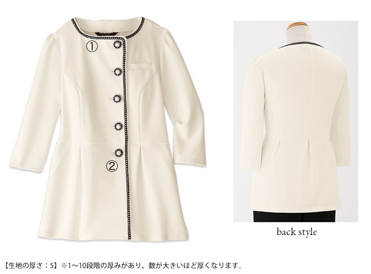 ニュアンスカラーのボーダー地にブレードやパール調ボタンなどのラグジュアリーな輝きが光るノーカラーの7分袖ソフトジャケット。着心地の良いニット素材はアイボリーなのに透けにくく、防汚加工で汚れも安心!