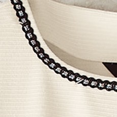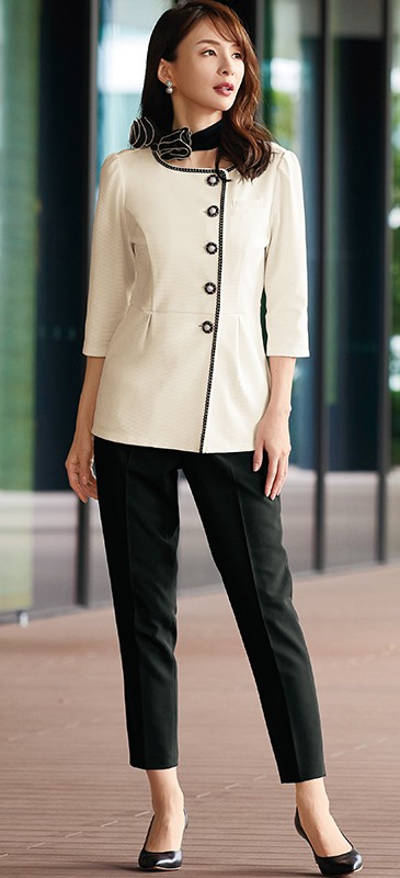 さり気ない光沢のある生地にブレードやパール調のボタンなど、まるでジュエリーの輝き。