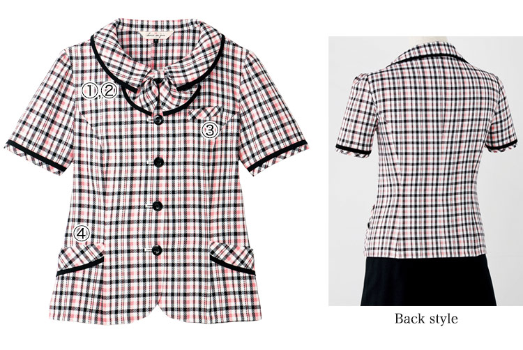 襟元のリボンが可愛らしい、チェック柄の涼し気なオーバーブラウス。吸汗速乾性で快適な着心地!