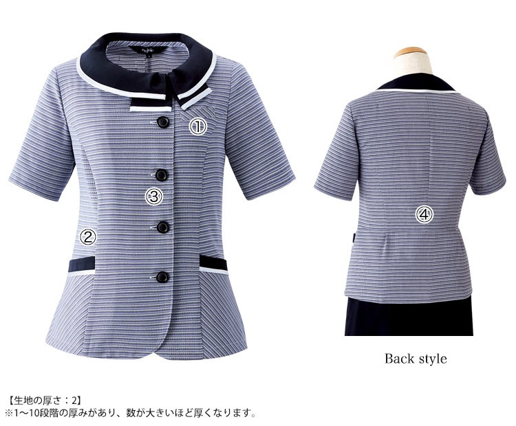 ウエストの切替えで後ろからの細見え効果を追求。また、お辞儀をしても背中が見えにくい安心感のある長めの丈です。