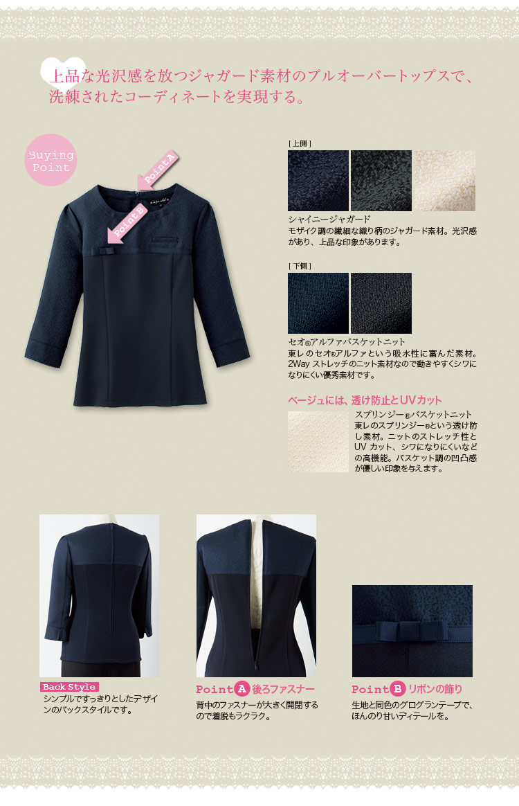 上品な光沢のラグジュアリー感にさりげないリボンが大人かわいいプルオーバー。