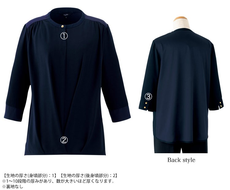 - ホームクリーニング、接触冷感(身頃部分)、UVカット、高通気(身頃部分)、生地厚1(身頃部分)、生地厚2(後身頃部分)