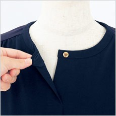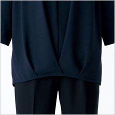 フロントボタンを外せばスキッパー風にも着こなせる、2WAYラウンドネックブラウス。大きく取ったタックと長めの着丈で体型をカバーしてくれます。