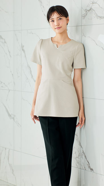洗練されたデザインに胸元ビジューの煌めきが女性を美しく魅せる、ワンランク上のチュニック。美容医療・サロン・クリニックなどで、“美”への意識を高める一着です。伸びやかなニット素材は防汚加工付きで、快適に安心して着用いただけます。