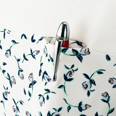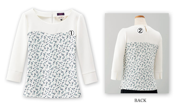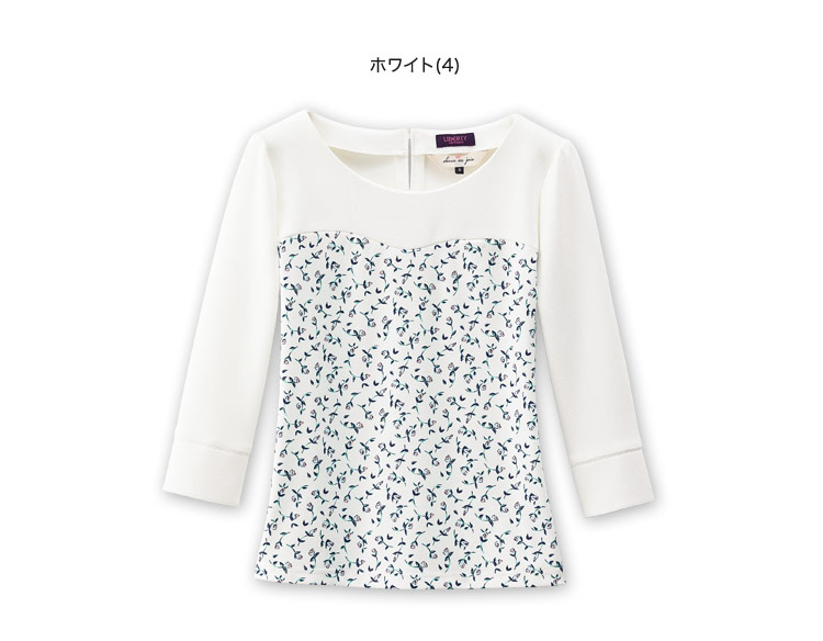 爽やかな雰囲気の「フローティング・フローラ」という小花柄のプリントが女性らしい柔らかさを演出。ニット素材で軽く、ストレッチ性があります。白ベースなのに透けにくく、シワになりにくいのも特徴です。