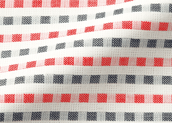 インパクトのあるブロックチェックは、白地に赤と紺の格子でモダンな印象を与えます。二重織の平組織でしっかりと織り込まれていますが、ソフトな風合いで肌あたりも良く、高通気で夏に適した素材です。