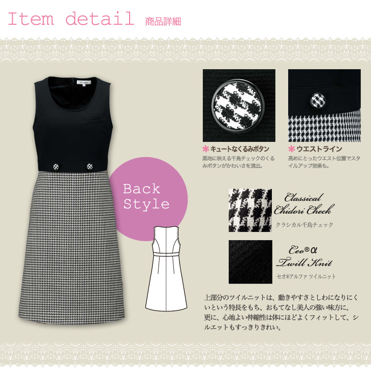 - 身頃部分:セオアルファツイルニット(ポリエステル100%)、スカート部分:クラシカル千鳥チェック(ポリエステル65%、毛35%)