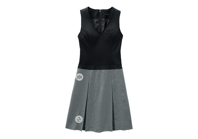 - 身頃部分:アクティブストレッチニット(ポリエステル100%)/スカート部分:チェリッシュバーズアイ(ポリエステル75%、毛25%)