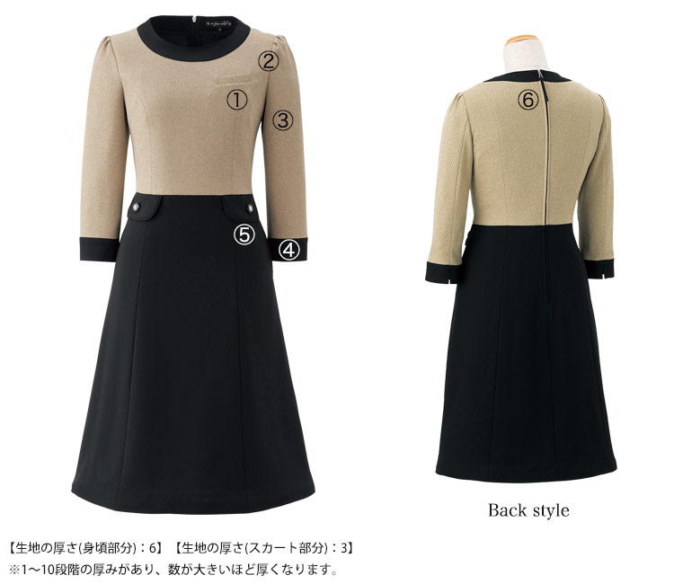 - ホームクリーニング、2WAYストレッチ、生地厚6(身頃部分)、生地厚3(スカート部分)