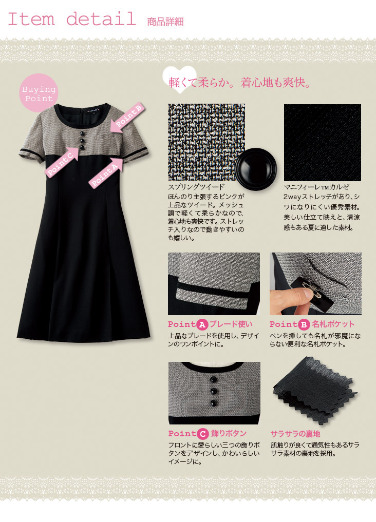 - 身頃・袖部分:スプリングツイード(ポリエステル70%、毛25%、ナイロン5%)/スカート部分:マニフィーレカルゼ(ポリエステル100%)
