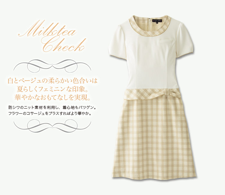 - 身頃・袖部分(セオアルファアクティブストレッチニット:ポリエステル100%)、スカート部分(ミルクティーチェック:ポリエステル70%・アクリル13%・毛11%・ナイロン6%)