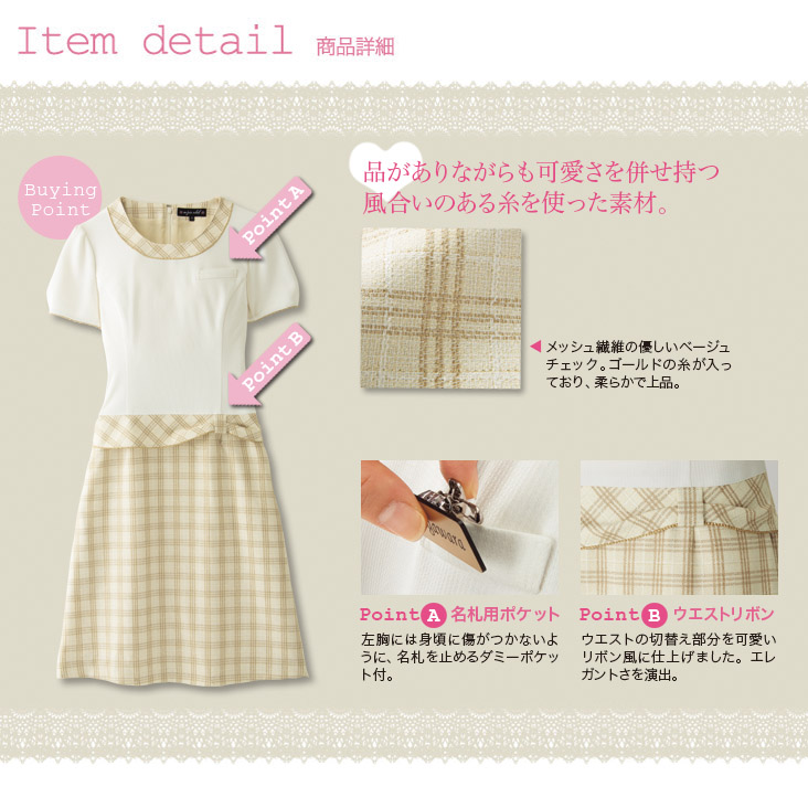 - 身頃・袖部分(セオアルファアクティブストレッチニット:ポリエステル100%)、スカート部分(ミルクティーチェック:ポリエステル70%・アクリル13%・毛11%・ナイロン6%)