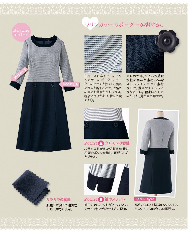 ボーダーネイビーできちんと感とやわらかさのあるワンピース。ウエストのフラワーボタンが可憐な印象で、医療事務にも人気です!