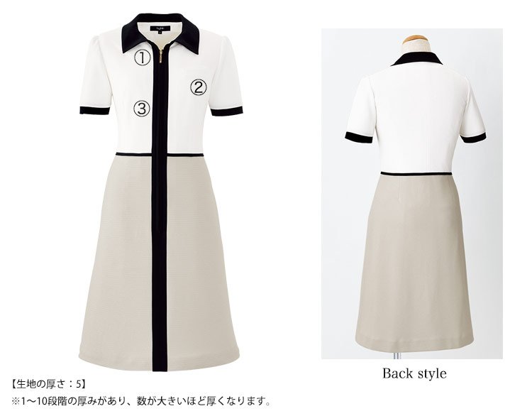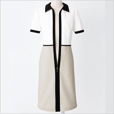ブラックの配色を効かせ、胸元で光るジュエリーチャームがさりげなく華やかなワンピース。前ファスナー仕様で着脱もラクです。美容医療・サロン・クリニックなどで、“美”への意識を高める一着です。伸びやかなニット素材は防汚加工付きで、快適に安心して着用いただけます。