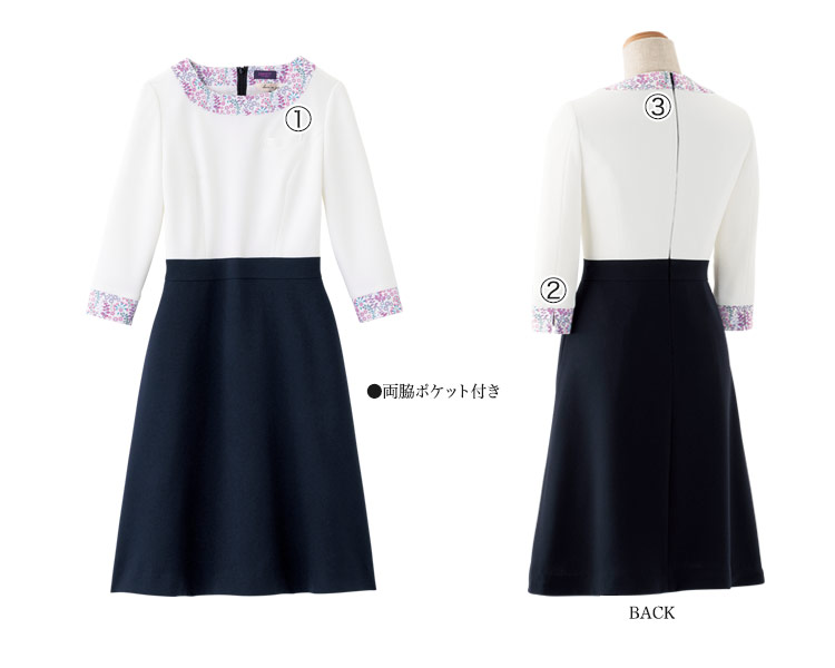 - 身頃:バスケットニット(スプリンジー®使用)/ポリエステル100% スカート:ストレッチアムンゼン(ポリエステル55%/複合繊維(ポリエステル)45%)
