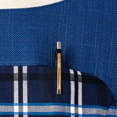 深みのある紺をベースに、リボンを重ねたようなチェック柄。スポーティですっきとした印象を与えます。再生ポリエステルを一部使用し、環境にも配慮した素材です。
