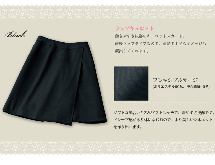 動きやすさ抜群のキュロットスカート。前後ラップタイプなので清楚で上品なイメージを演出してくれます。