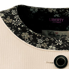 襟ぐりのリバティプリントの花柄が、顔周りを華やかな雰囲気に仕上げます。
