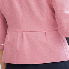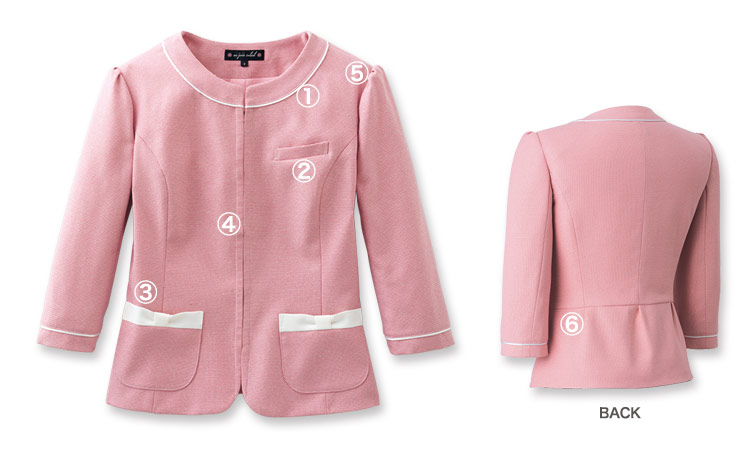 さりげないラメがきらめく、やさしいピンクが華やかなツイード素材ジャケット。企業受付や接客業におすすめのおもてなしスタイルです。