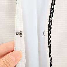 さり気ない光沢のある生地にブレードやパール調のボタンなど、まるでジュエリーの輝き。