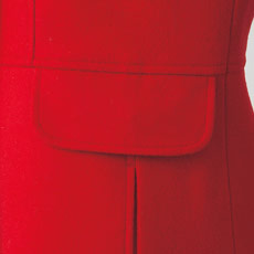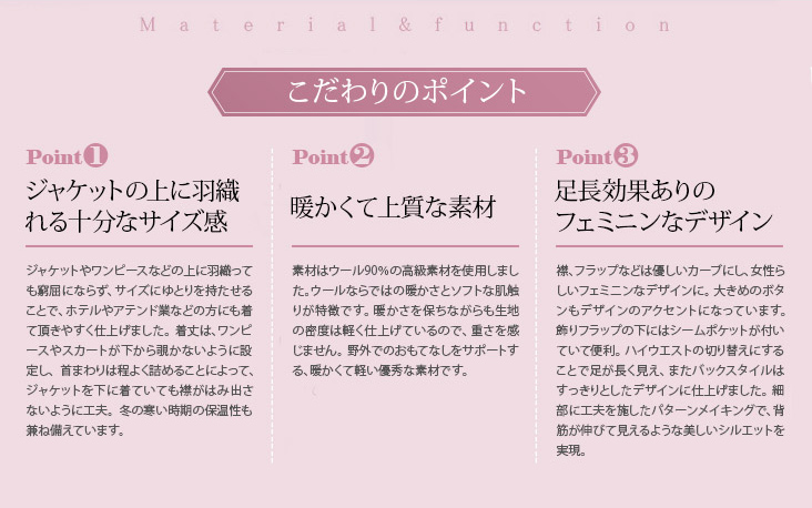 ウエストの切り替え部分にフラップを挟み込んだデザインで、フェミニンな印象に。