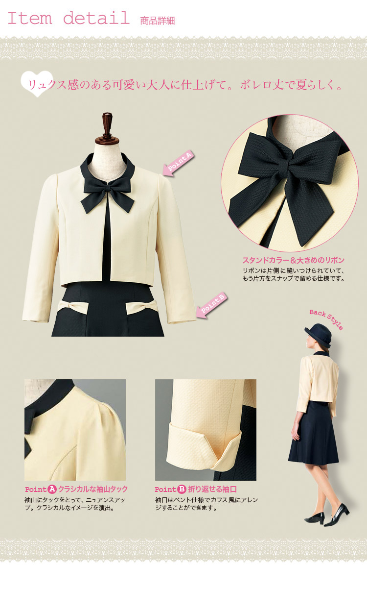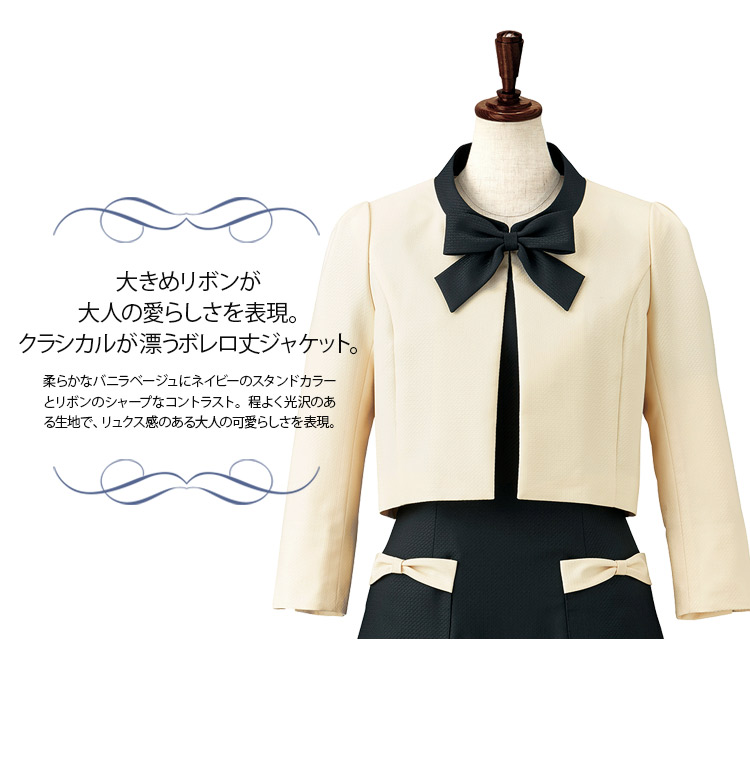ネイビー×バニラベージュのコンサバティブなカラーの組み合わせながら、プチリボンやスタンドカラーなどのディテールで、さり気なくキュートに見える大人かわいいジャケット。ボレロ丈で涼しげで軽やかな印象に。