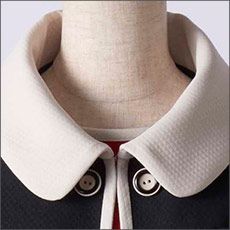 サンドベージュの丸みある襟は、首周りをほっそり見せ、可愛らしくも見せます。