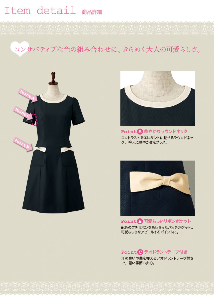 ベージュの配色のプチリボンをあしらったパッチポケットでキュートさを、程よく光沢のある生地はリュクス感をそれぞれ演出。大人のかわいらしさをアピールしたデザインのワンピース。