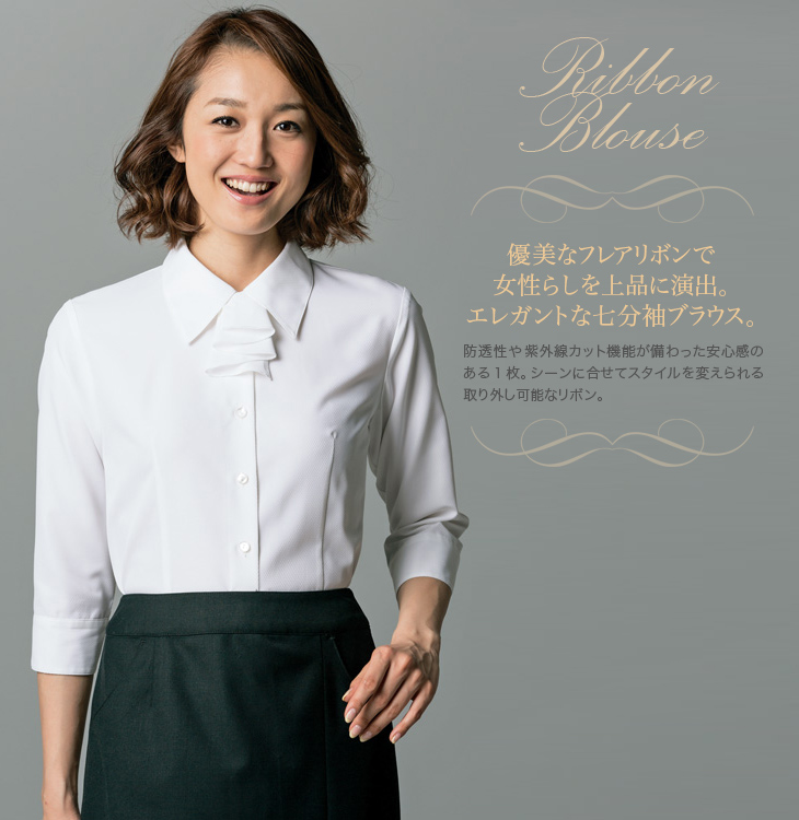 [通年]顔周りを上品に演出するフレアリボン付きブラウス[七分袖](22-AR1547)