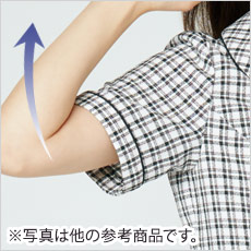 - 左右ポケット、左胸ポケット、スリット入り、デオドラントテープ、フレックスリーブⅡ、名札ホール付き、高通気、一重仕立て
