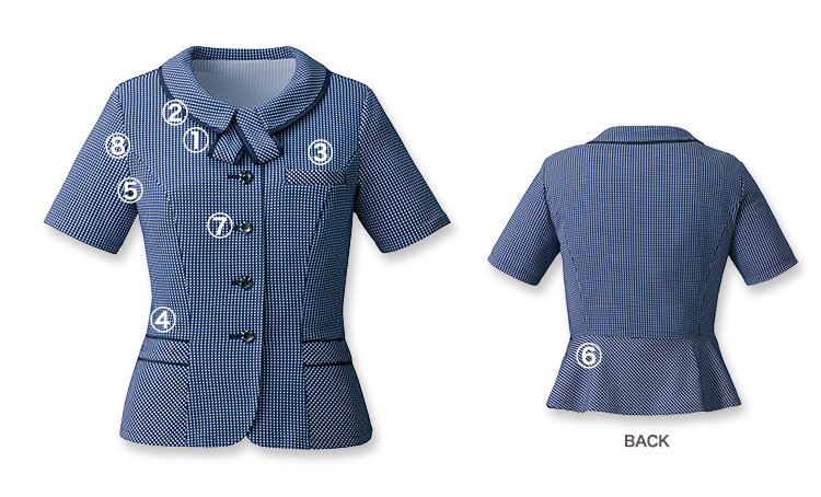 - 名札ポケット、左胸ポケット、デオドラントテープ、取り外しリボン、一重仕立て、フレックスリーブ