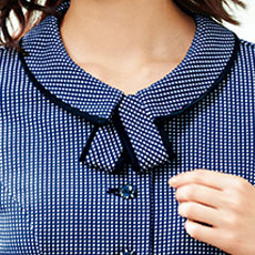 襟やポケットのトリミング配色が印象を引き締めます。また、リボンは取り外しが可能です。