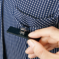 胸ポケットにペンをさしても名札が邪魔にならない名札ホール付き。