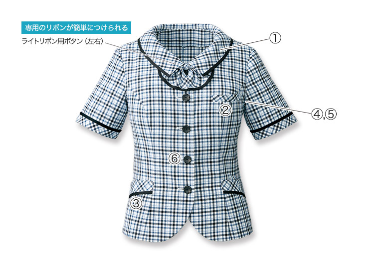 - 左胸ポケット、名札ポケット、左右ポケット、取り外し可能リボン、一重仕立て