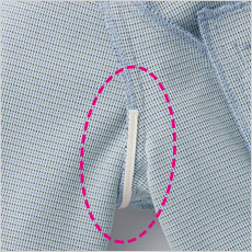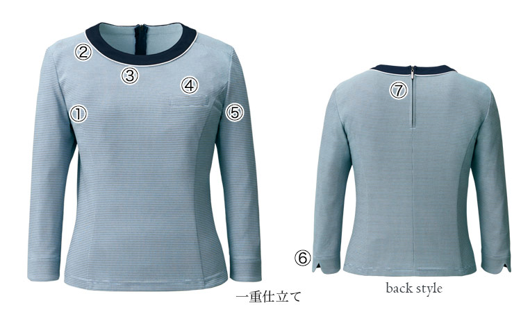 - 一重仕立て、左胸タフポケット、ペンホルダー、アクセサリー用ホール、フレックスリーブⅡ、デオドラントテープ、七分袖口スリット