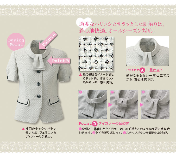 星の輝きをイメージさせるドット柄が、ラメ糸のようなキラキラ感を演出します。適度なハリコシとサラッとした肌触り。オールシーズン気回せる素材です。