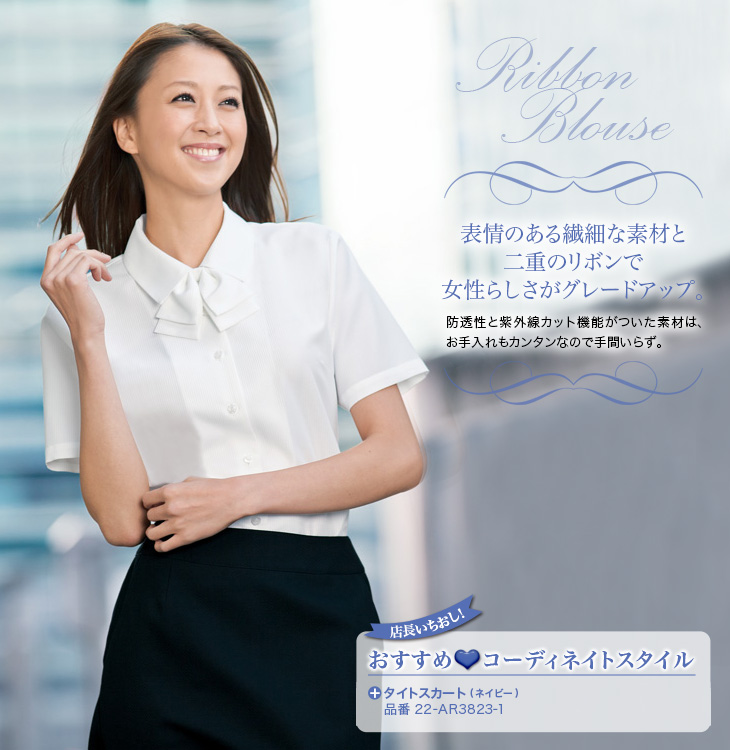 [通年]繊細素材×リボンが女性らしいブラウス[半袖][女性用](22-AR1662)
