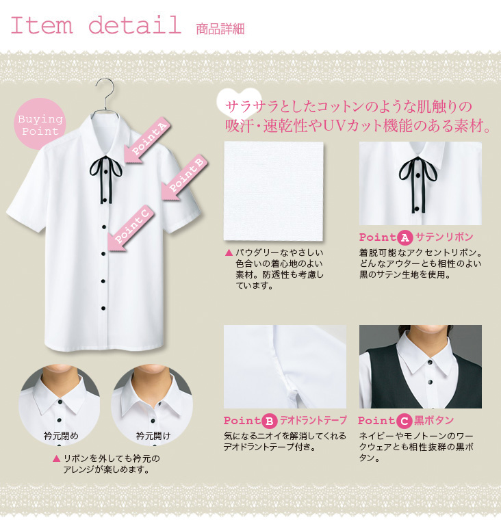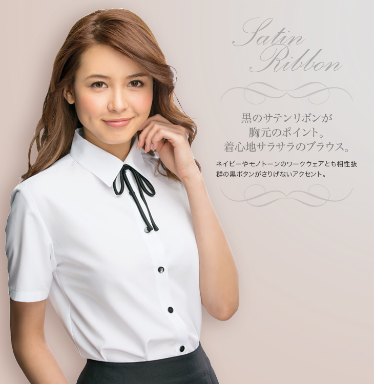 【在庫限り】[通年]キュートな黒のサテン リボン付きブラウス[半袖](22-AR1681)