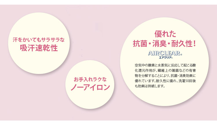 空気中の酸素と水蒸気に反応して起こる酸化還元作用が、繊維上の雑菌などの有機物を分解することにより、抗菌・消臭効果に優れています。