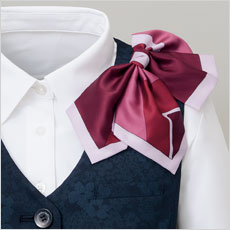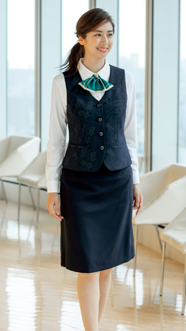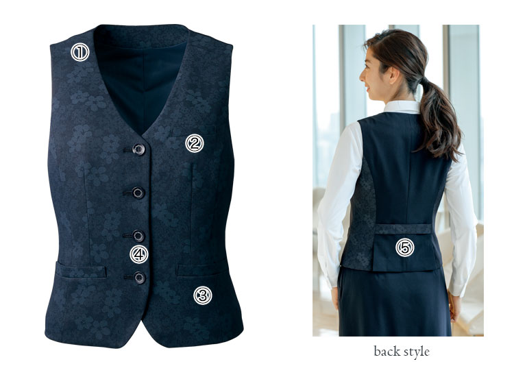 フラワープリントが新鮮な印象を醸し出すベスト。インカムを装着できる背ベルト付き。裾はサイドベンツ仕様です。