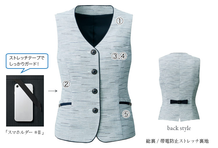 - 総裏、左胸タフポケット、ペンホルダー、アクセサリー用ホール(左右)、スマホルダーⅡ、ホルダーテープ(左のみ)、背ベルト、センタースリット