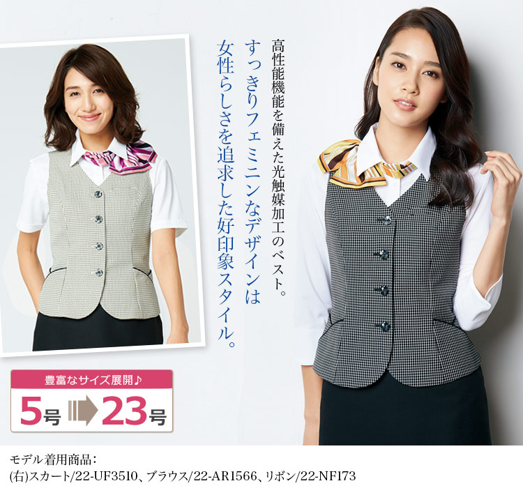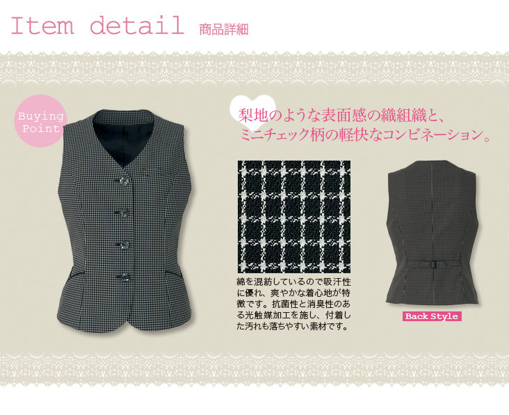 光の力でニオイを分解して、汚れもきれいに落とせる高機能なベスト。すっきりとフェミニンな女性らしいデザインと、豊富なサイズ展開が魅力です。