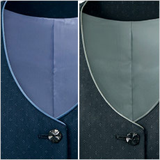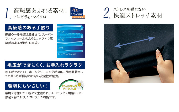高級ウールを超える極細のハイテク素材「トレビラ®・マイクロ」をミックスしたウール混素材。ネイビーにはブルー系、ブラックにはシルバー系のドットを配し、ほんのりと華やかさを演出。