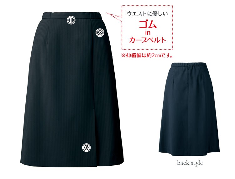 スマートなイメージを演出する片プリーツ入りのタイトスカート。ウエストはゴム入りで、窮屈さのない快適な着用感です。